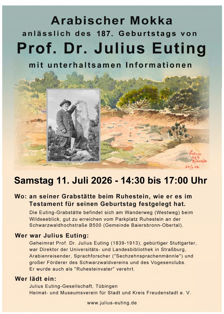 Eine spezielle Bedeutung hat die Freudenstädter Stele für die Gesellschaft, die seit 2004 das Andenken an Julius Euting wieder aktiv aufleben lässt. Eutings Engagement für die semitische Sprachwissenschaft, die Erforschung alter Kulturen in Europa und im Nahen Osten, für die Wanderbewegung zu Ende des 19. Jahrhunderts (Schwarzwald, Vogesen) und seine Passion für die künstlerische Erfassung dessen, was er in nah und fern sah, sind geradezu überwältigend. Dem Multitalent Euting gelang es allerdings nicht, sich die Tayma-Stele nach seiner Arabien-Reise in 1883-84 nach Strasbourg liefern zu lassen: sie gelangte 1885 nach Paris. Ab Juli 2022 hat nun die Stele ein Avatar in Freudenstadt!